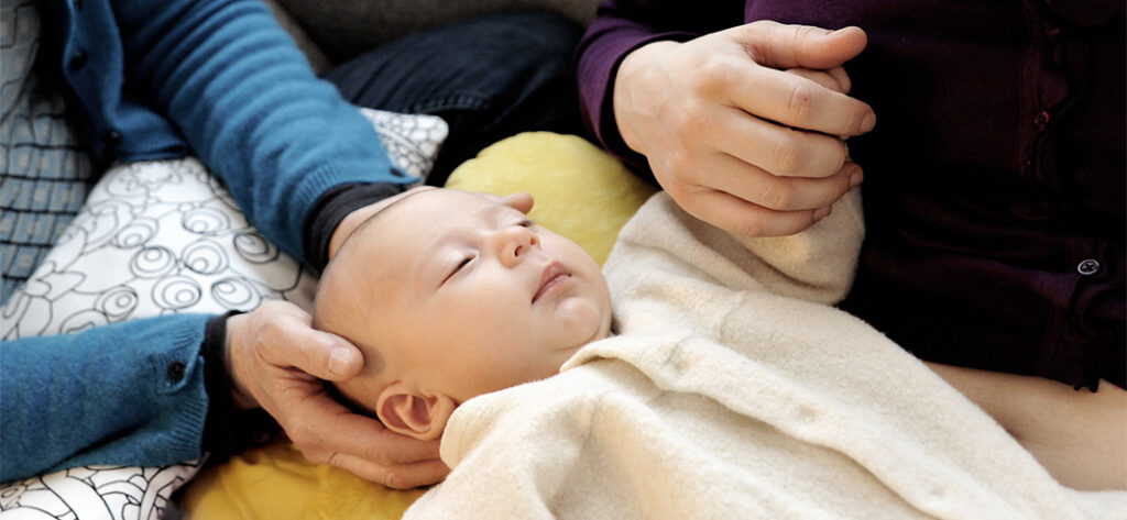 Die craniosacralen Berührungstechniken sind sehr sanft und respektvoll. Das Kind ist meistens im nahen Körperkontakt zu seinen Eltern.